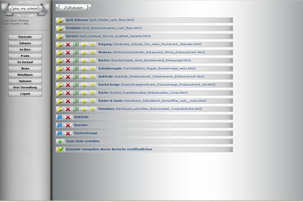 Bereichsseiten-Bearbeitungsmenü. Hierüber gelangt man u.a. zur Berabeitung einzelner Seiten, kann neue Seiten erstellen und die Reihenfolge in der Navigation bestimmen.