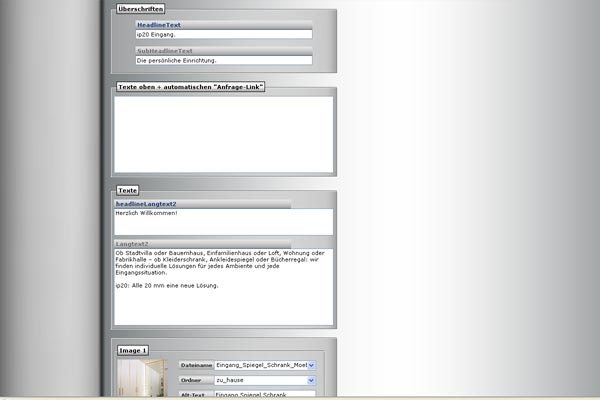 Seiten-Bearbeitungsmenü (mittlerer Teil). Hier werden Texte und Überschriften eingegeben.